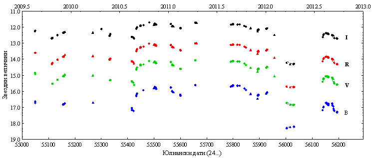 Криви на блясъка на V582 Aur във филтрите BVRI от август 2009 до септември 2012 г., по наблюдения с 2-м RCC, 50/70 см Шмит и 60-см Касегрен телескопи на НАО Рожен и 1.3-м телескоп на обсерваторията Скинакас (Гърция). Обяснението на наблюдаваните изменения на блясъка и спектъра на V582 Aur може да се търси в структурата и свойствата на околозвездия диск. Възможно е дискът да се състои от зони с различна плътност, т.е. в него да е започнало формирането на планети, и поради тази причина темпа на акреция да се променя значително с времето. Друг модел, обясняващ нашите наблюдения е наличието на втори компонент в системата – звезда или голяма планета, която се движи по силно епиптична орбита около централната звезда. Тогава, навлизайки в зоната на околозвездия диск, втория компонент предизвиква гравитационни смущения и съответно усилва или отслабва темпа на актеция. Регистрирането на периодичност в промяната на блясъка би било силен аргумент за правилността на втория модел. Уникалността на получените резултати се състои във възможността да изследваме непосредствено еволюцията на младите звезди и формирането на планетни системи около тях. доц. д-р Евгени Семков ас. д-р Стоянка Пенева