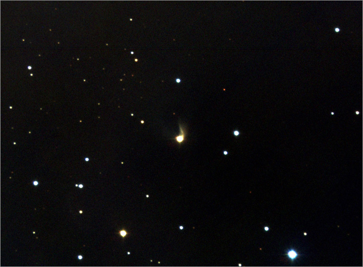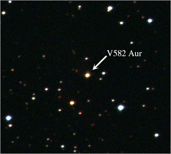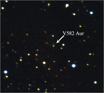 Наблюдения на V582 Aur с Шмит телескопа на НАО Рожен, в ляво от 4 април 2011 г., в дясно от 12 април 2012 г. Само една година по-късно звездата е по-слаба с 2.8 звездни величини във видимата област на спектъра. (Снимките са получени чрез съвместяването на по три кадъра в B, V и R филтри)