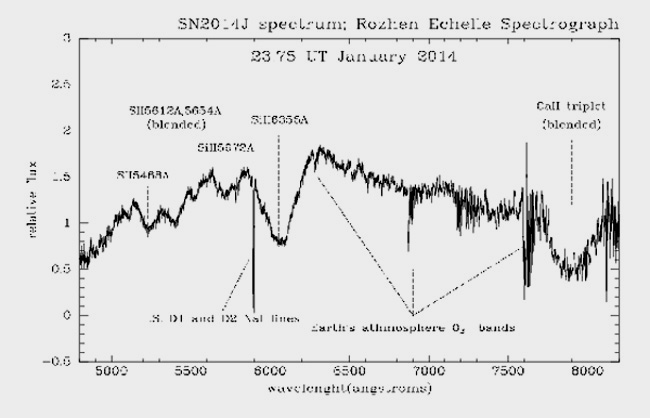 Спектър получен с новия високодисперсен спектрограф на Националната астрономическа обсерватория Рожен, на регистрираната на 21-ви януари свръхнова звезда SN2014J, избухнала в галактиката M82 (съзвездие Голяма мечка). На фигурата са означени следните детайли: D1 и D2 – линии на дублета на неутралния натрий (NaI), които се формират от поглъщане от междузвездния газ в нашата галактика и в M82, както и от този в междугалактичното пространство. Отбелязани са още ивиците на поглъщане на атомния кислород в земната атмосфера, лините на еднократно йонизирания силиций (SiII 6355?, 5972?), на сярата (SII 5468?, 5612?, 5654?) и на калция (CaII 8484?, 8522?, 8642?). По отместването на наблюдаваната дължина на вълната на тези спектрални линия от техните лабораторни стойности са измерени скорости на разширяващия се газ от избухналата звезда 14100 и 12300 km/s. Поради голямата дисперсия на скоростите на разширяващия се газ се наблюдава силно блиндиране (припокриване) на линиите. Получените резултати са част от съвместен проект с астрономи от университета в Торун, Полша. На 6 януари 2014 година в Националната астрономическа обсерватория започна последния етап от пускането в експлоатация на новия високодисперсен спектрограф от тип ешеле. Спектрографът е разположен върху маса с пневматични крака в помещение с контрол върху параметрите на работната среда, намиращо се на етажа под телескопа. Светлина в спектрографа се подава по 30 метров световод от фокуса на 2-метровия телескоп на НАО. Първи спектри на астрономически обекти с новия инструмент бяха получени на 10 януари. В следващите няколко нощи бяха извършени настройки, целящи оптимизиране на работата на новия инструмент. Наблюденията продължиха от 20 до 24 януари, когато българските астрономи имаха възможността да дадат своя принос в изучаването на регистрираната на 21 януари свръхнова звезда SN2014J в близката галактика M82. В нощта на 23 срещу 24 януари в НАО Рожен беше получен спектъра на свръхновата, показан в началото на тази новина. Повече подробности за първото в нашата страна изследване на този астрономически феномен са представени в публикуваната астрономическа телеграма. Кадри на избухналата звезда бяха направени с дистанционно управляеми телескопи, разположени на територията на НАО (http://www.irida-observatory.org/Observations/M82-SN2014J/M82-SN2014J.html). Първото съобщение за избухналата свръхнова бе направено от S. J. Fossey и неговите студенти, които получават снимки на галактиката М82 на 21 януари в 19:20 GMT. Кадрите са получени с учебна цел, с 35 см телескоп на UCL (University College London). Международният астрономически съюз потвърждава откритието и обектът е регистриран под името SN2014J. До момента са излезли 20 “бързи” съобщения в The Astronomer's Telegram, дискутиращи развитието и параметрите на избухването, които дават основание свръхновата да бъде класифицирана като тип “Ia” – бяло джудже, което “засмуква” вещество от близък до него съсед. Всъщност ние наблюдаваме поведението на една звезда в края на нейния живот. Белите джуджета са звезди с размерите на Земята и маса, която не може да надвишава тази на Слънцето с около 44%. Това е критична стойност за масите на звезди с такива размери. Когато бялото джудже се намира в "съжителство" с друга звезда, могат да се създадат условия, при които под действието на гравитацията, вещество от компаньона да започне да се прехвърля върху бялото джудже т.е. джуд