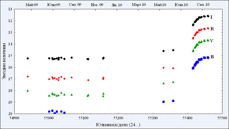 15 септември 2010 - Избухване на нова звезда от типа FU Orionis открито в НАО Рожен. За първи път в света е регистрирано началото на такова избухванеБългарски астрономи откриха нова звезда от типа FU Orionis по наблюдения с 50/70 см Шмит телескоп на Националната астрономическа обсерватория Рожен. Звездите от този тип са млади обекти, които са в процес на гравитационно свиване и около тях съществуват масивни околозвездни дискове. По време на еволюцията на звездите, част от веществото на околозвездия диск пада върху повърхността на звездата. При възникване на нестабилност на диска, причините за която не са уточнени все още, количеството вещество падащо от околозвездния диск на звездата повърхност се увеличава многократно. Тогава се наблюдава мощно избухване на звездата, при което блясъка й се увеличава с 4-5 звездни величини (увеличението на светимостта е от порядъка на 100 пъти) за период от няколко десетки години.